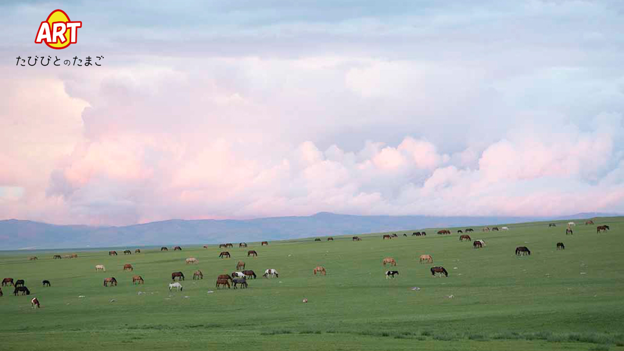 大草原で草をはむ、馬や羊たちの群れ。近くには遊牧民のゲルも点在しています。