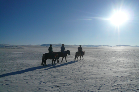 朝食後、ツーリストキャンプを拠点に大雪原を乗馬ライディング。途中、遊牧民のゲルを訪問します。遊牧民特製手作りチーズや乳茶などをお楽しみください。ガイドを通して遊牧民との交流やご質問もどうぞ。(期間中1軒程度の訪問)