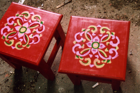 - モンゴルの代表的な宿泊施設ツーリストキャンプゲル。その中に備え付けてある色彩食豊かな手軽で持ち運びができる可愛らしい四角い小さな椅子に絵付け体験!絵付けが終わったら記念にお持ち帰りができます。